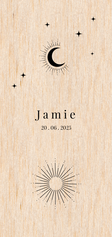 Langwerpig echt houten geboortekaartje met zon, maan en sterren