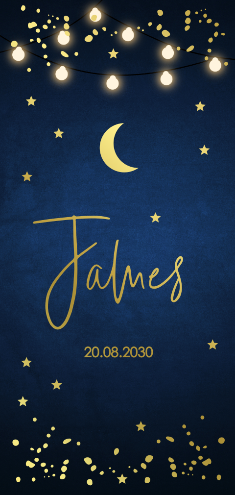 Blauw geboortekaartje met maan, sterren en goudfolie